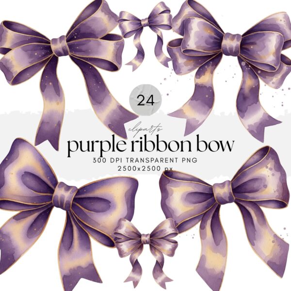 The 24 Purple Ribbon Bow ClipArt collection features high-resolution PNG images, offering elegant and versatile designs. Perfect for projects like invitations, scrapbooking, social media, and printables, these purple ribbon bows fit a variety of creative needs. Ideal for fashion, gifts, or celebration-themed designs.